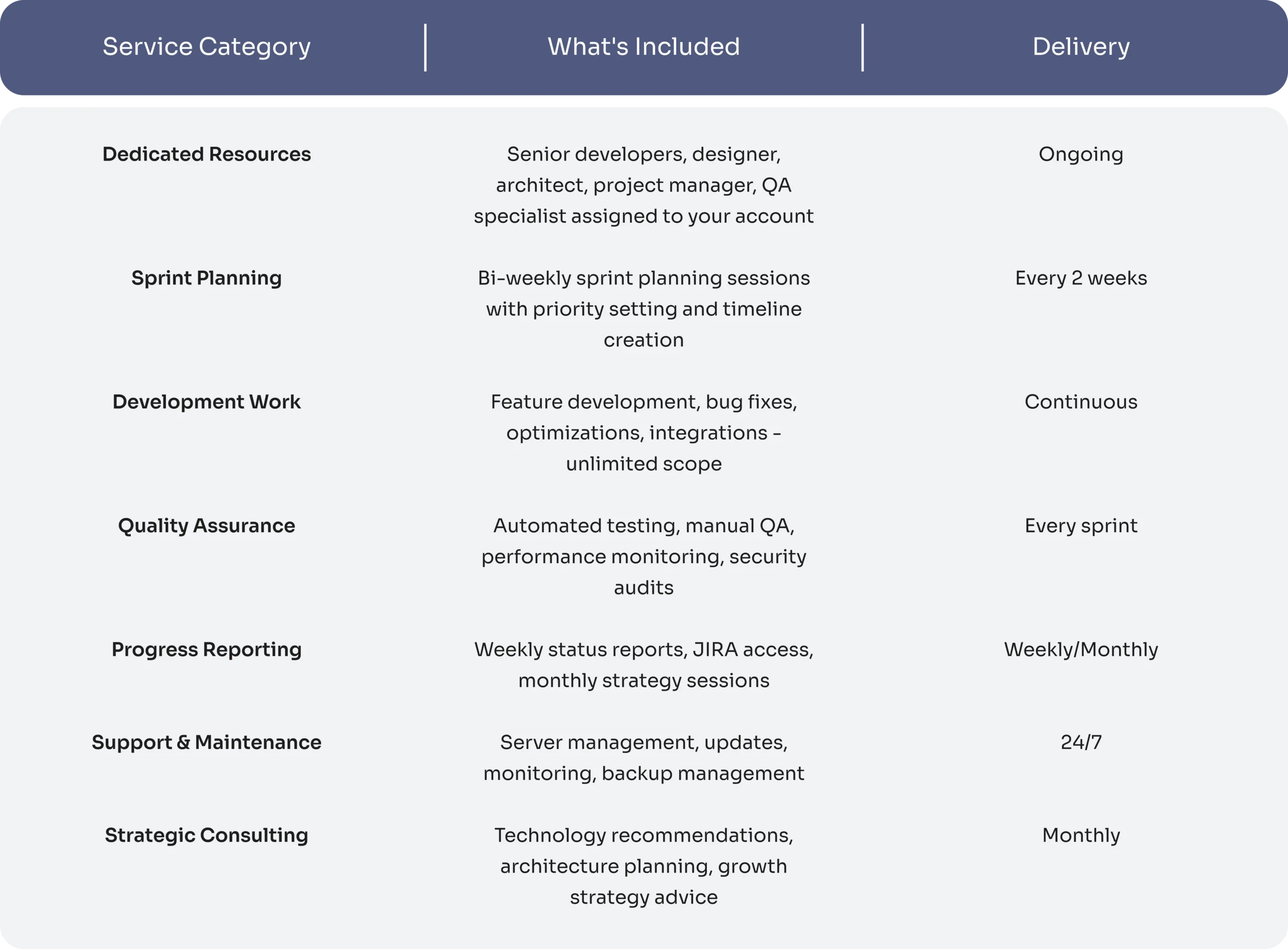 Monthly retainer covers all development needs – no rescoping or surprise fees